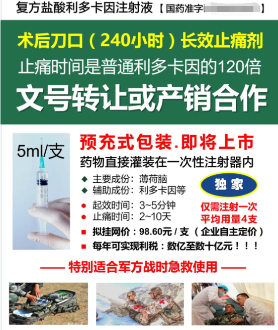 复方盐酸利多卡因注射液批件转让或寻求合作